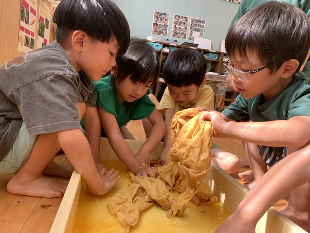 色水遊びや食育活動で玉ねぎの皮剥きをしたことで、保育者が玉ねぎの皮で布染めをすることを提案しました。