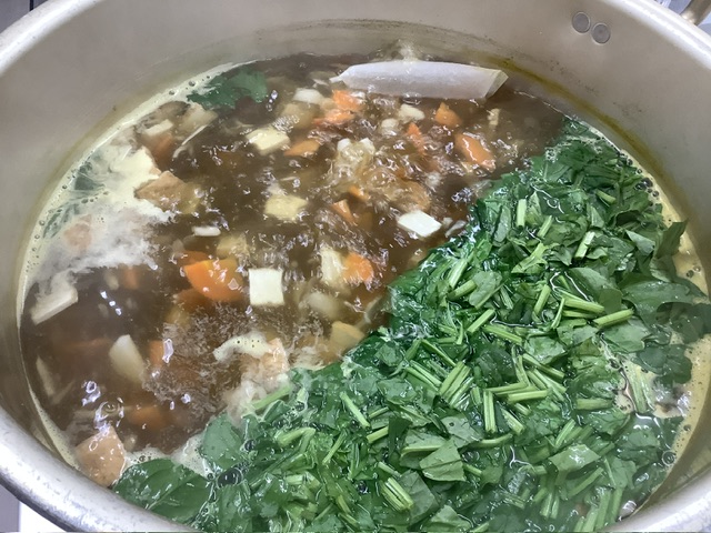 お味噌汁の具材には、厚揚げ、にんじん、舞茸、ほうれん草、かぼちゃ、35ファームの里芋が入りました。