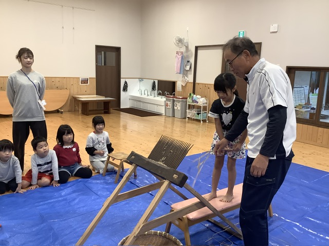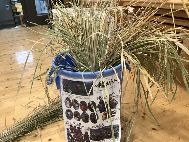 給食前には、お米の脱穀も行ない、お米の大切さを学んださくら組。しっかり、手のひらのお米を一粒残らず食べていましたよ。