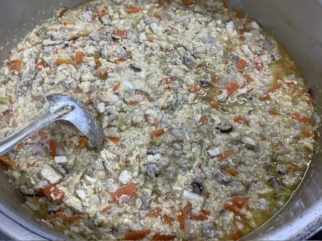 たっぷりのかつお、昆布で出汁をとり、玉ねぎ、にんじん、深葱、厚揚げ、干ししいたけを炒めて煮込んだ後、ヤブサメファームの新鮮な卵で旨みをとじこめました。