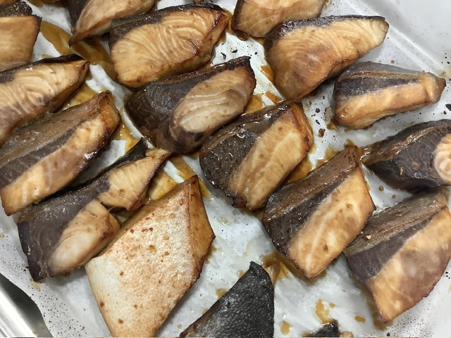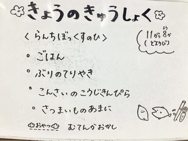 山口水産から届いたぶりを、濃口醤油・きび糖・味の母・酒とすりおろし生姜に漬け込んで焼き上げました。ぶりは11月から2月ごろの冬に旬を迎え、中でもこの時期に獲れるぶりは「寒ぶり」とも呼ぶそうです。脂がのって身の柔らかいぶりは、こども達にも人気でした!