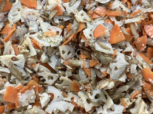 れんこん・にんじん・ごぼうの3種類の根菜をごま油で炒めました。ごぼうは、あく抜きの代わりに梅酢で蒸し煮をしてから一緒に炒めています。