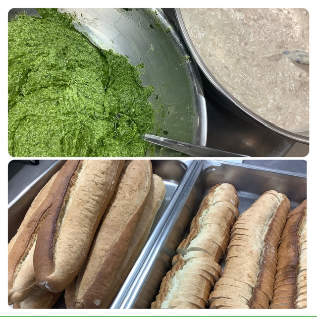 “カラダ喜ぶオーガニックベーカリーひまわり”のバケットに春菊とツナの豆乳マヨパテをバケットに添えて提供しました。