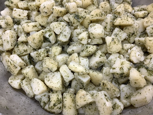 じゃがいもをスチームで蒸し、青のりと塩をまぶしています。シンプルな材料ですが、ホクホクのじゃがいもとのりの風味がぴったりの組み合わせです!こども達も何度もおかわりをしてくれました。