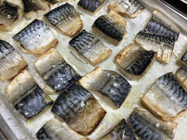 さばに0.8%の塩で味付けをして、オーブンで焼き上げました。脂が乗っていてジューシーな美味しい塩焼きに仕上がりました。