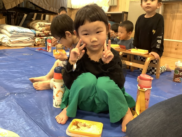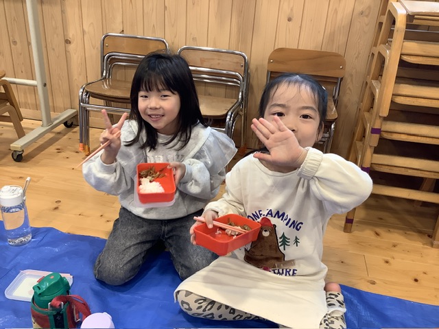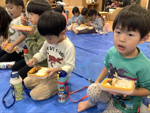 今日はランチルームにシートを敷いて、きく組・もも組・さくら組で一緒にランチボックスを囲みました。賑やかな雰囲気で楽しい給食時間になりました☺️