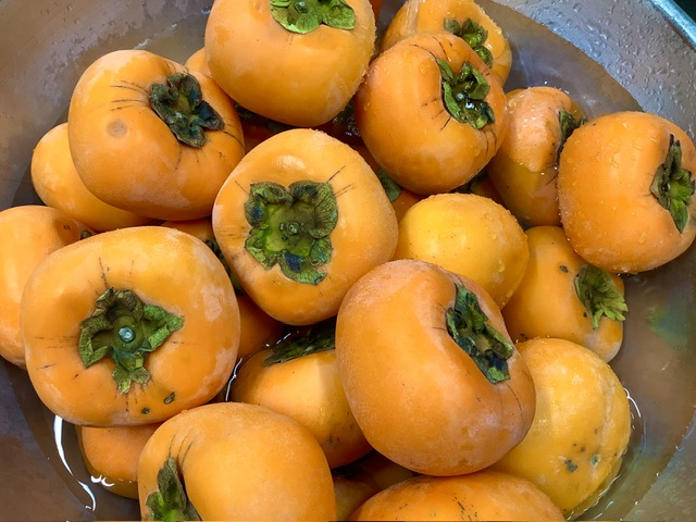 今日のおやつは、柿でした。敬愛食品から、種なしの甘い柿が届きました!