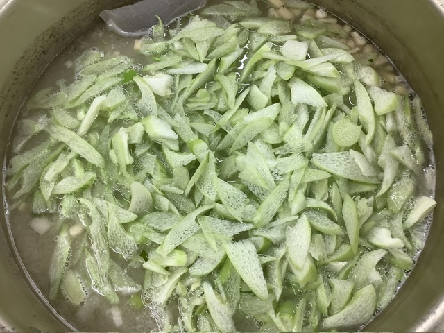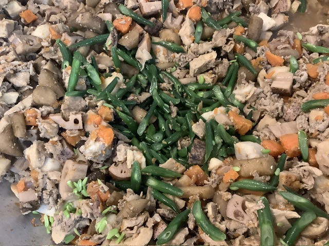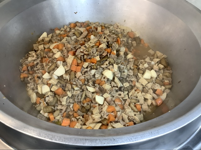 今日の筑前煮には、豚肉、レンコン、蒸し煮をしたごぼう、高野豆腐、干し椎茸、35ファームで収穫したインゲンと里芋が入りました。濃口醤油や薄口醤油、きび糖、みりん、酒で味を整えてじっくり煮込みました。