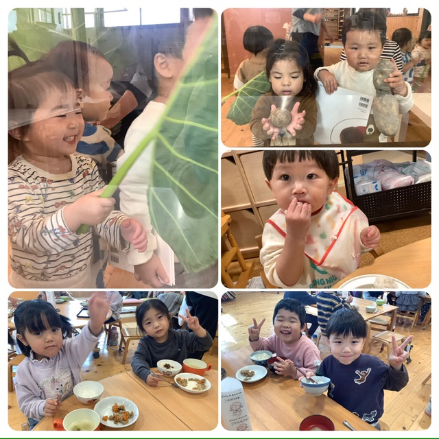 給食室前で展示をすると、今日の食材に触れたり、匂いを嗅いだり、興味津々でしたよ!