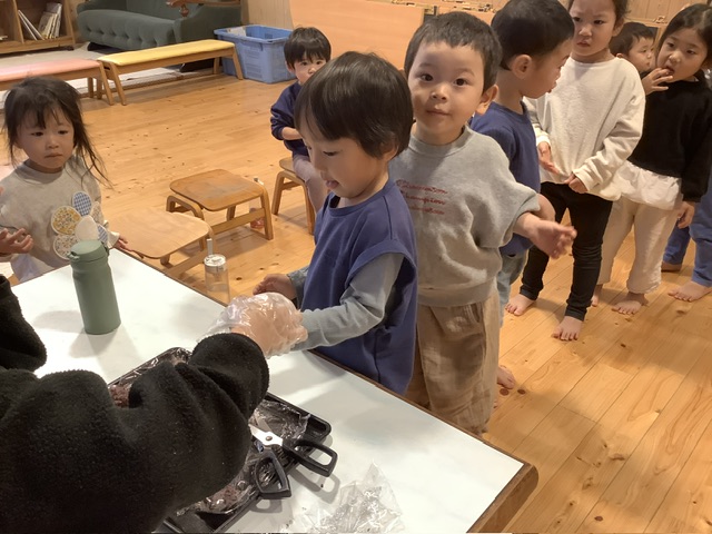 初めは食べ慣れない小豆に少し戸惑っていた子も、一口食べてみると「美味しい!」とおかわりまで食べていました!どこのクラスでも大人気のおやつでした🌟