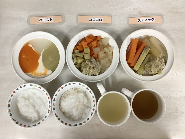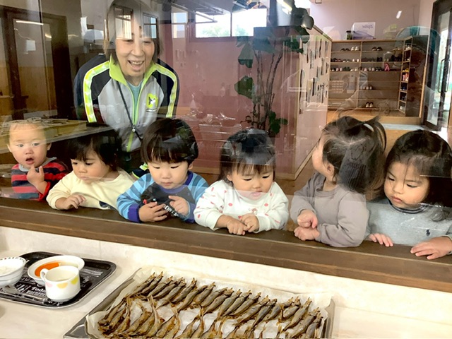 給食室を見に来ていたさくらんぼ組のこども達の前に並べてみると、指をさしながら「おさかなあるよ〜!」と嬉しそうな様子でした☺️