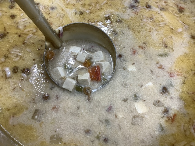 さいの目に切った木綿豆腐・トマト・玉ねぎ・南州農場のベーコン・いんげん・なめこが入っています。かつお出汁で具材を煮込み、仕上げにたっぷりの豆乳、麦味噌、濃口醤油で味を調えて出来上がりです。
