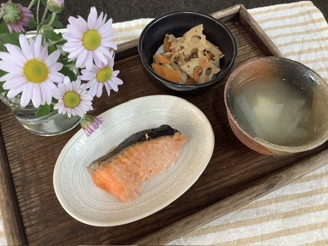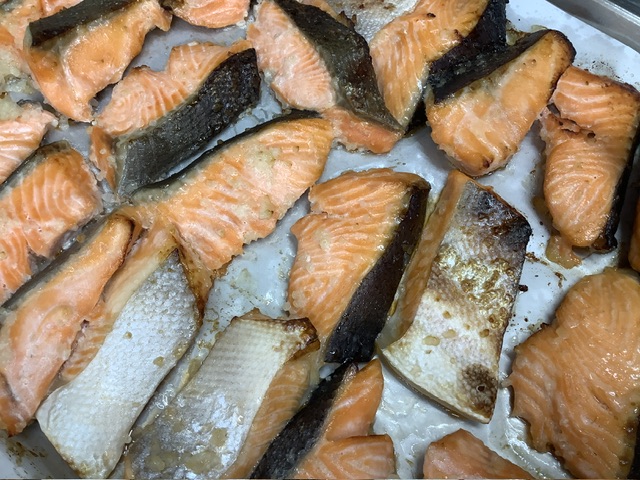 山口水産から届いた鮭を給食室手作りの塩麹に漬け込み、オーブンで焼き上げました。