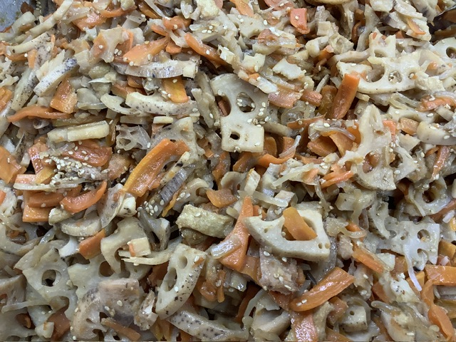 れんこん・にんじん・しらたき・油揚げを炒め、濃口醤油・味の母・きび糖で味を調えました。