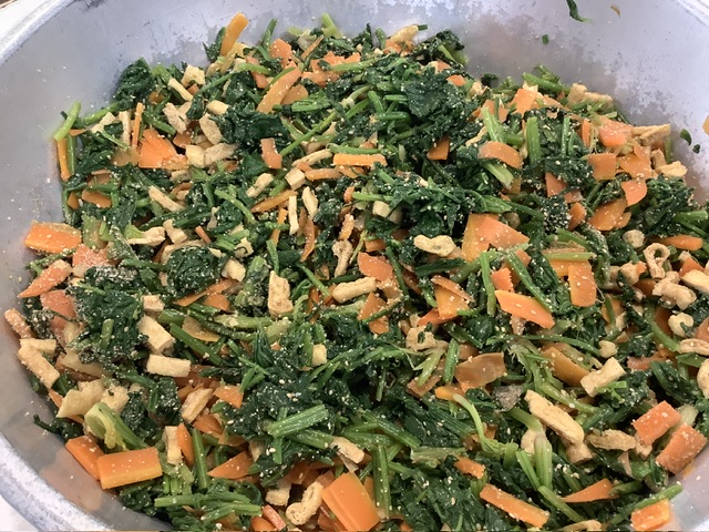 すりごまをたくさん加え、濃口醤油と一緒に混ぜ合わせます。ごまの風味、ほうれん草の甘さを感じる美味しい胡麻和えに仕上がりました。野菜が苦手な子も、ほうれん草は食べやすい野菜なので、よく食べる姿が多く見受けられました。