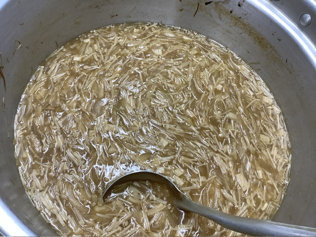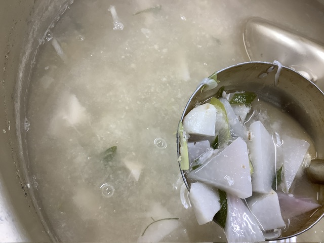 35ファームの里芋と赤かぶ、深葱が入りました。里芋がホクホクと甘く、トロっとして身体が温まる味噌汁に仕上がりました。