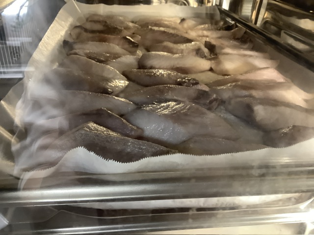 山口水産から届いたしいらを、塩と酒をふったら、片栗粉をまぶしてスチコンで焼きます。