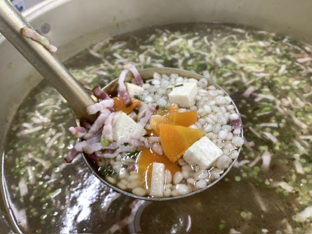 鰹節と昆布でとった出汁に、押し麦、南州農場のベーコン、木綿豆腐、にんじん、エリンギ、小ネギが入りました。押し麦のプチプチとした食感、ベーコンと野菜の旨味も合わさり、おかわりの行列が絶えませんでした。