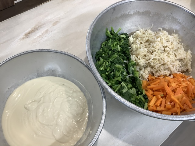 切干大根は水に戻したら、薄口醤油と味の母で下味をつけ煮詰めます。にんじん、35ファームの小松菜はスチームにかけ、給食室お手製の豆乳マヨネーズとすりごまを一緒に混ぜ合わせます。ごまの香りが鼻を抜け、とても美味しいサラダに仕上がりました。
