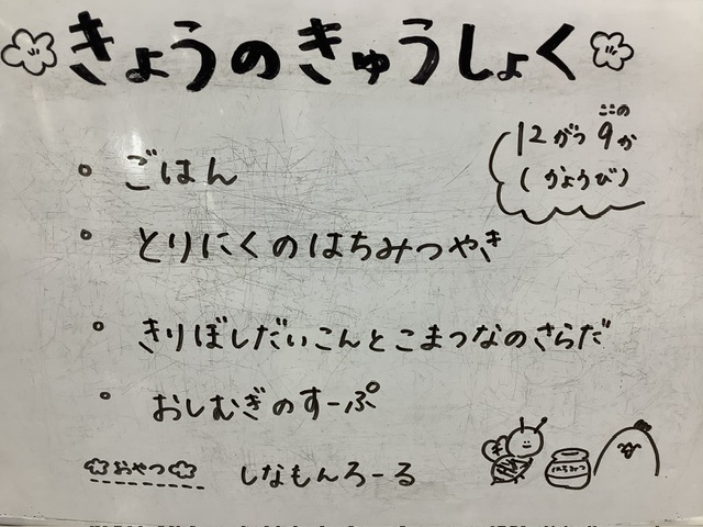 シナモンロールにかけるアイシングに、普段はレモン汁を使うのですが、今日は“橙”を使いました。口に入れた瞬間、橙の爽やかな香りがふわっと、口いっぱいに幸せが広がります♡今の時期にしか味わうことのできない橙を、給食室でいろいろなメニューに使っていきたいと思います。