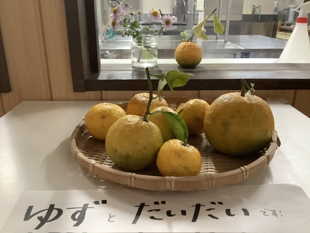 給食室前に“橙”と“ゆず”を展示しています。送迎の際に、お子様と一緒に手に取ってみてください。とても良い香りがしますよ♪
