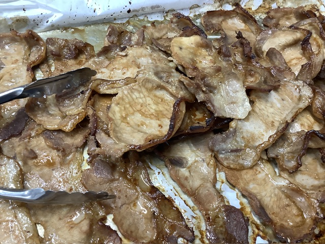 豚肉をすりおろし生姜、きび糖、酒、濃口醤油、みりんを合わせた調味液に漬け込んで、丁寧に一枚ずつ並べて焼きました。