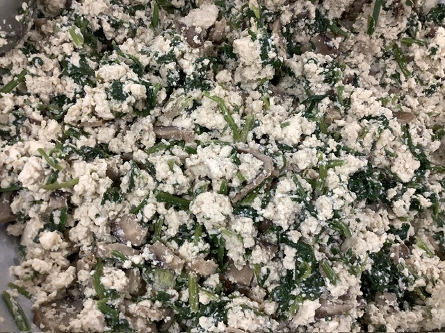 水切りした豆腐に、戻して甘く煮た干し椎茸、35ファームのほうれん草がたっぷり入り、ねりごま、すりごま、麦味噌、きび糖、薄口醤油と濃口醤油の調味料で和えました。