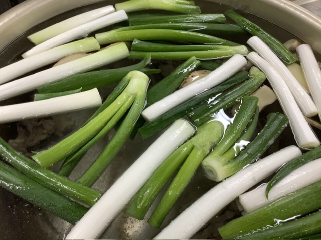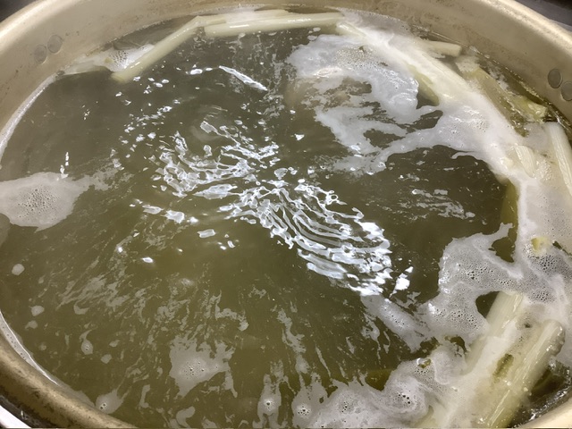 給食室でも、鶏ガラ・深ねぎ・生姜をじっくり煮込み、丁寧にアクを取りながら煮出しました。
