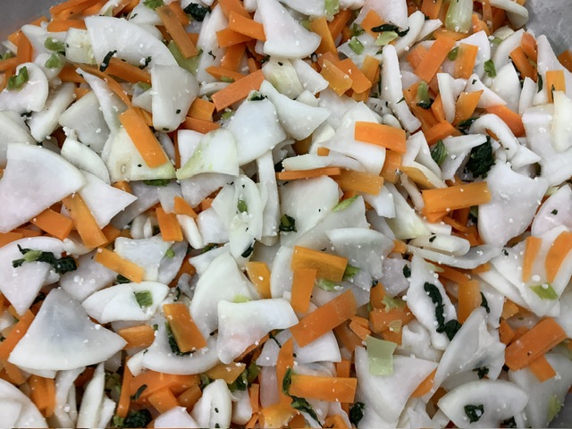 かぶ・小松菜・にんじんをスチームにかけて、給食室手作りの塩麹で和えました。