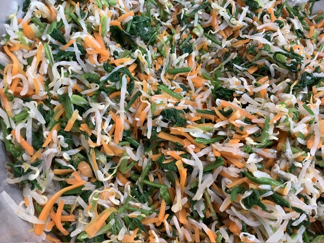 35ファームのほうれん草、もやし、にんじん、しらす干しを調味料で和えました。
