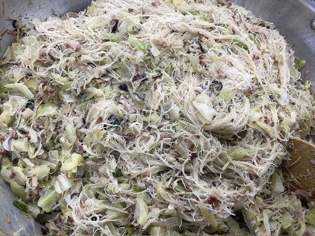 ベーコンをよく炒め、玉ねぎ、たっぷりのえのきと椎茸、キャベツ、お湯で戻したビーフンを炒めて、調味料で味付けします。ベーコンやキノコの旨みが出て、きのこが苦手な子でも気にせずモリモリ食べてくれる一品です。