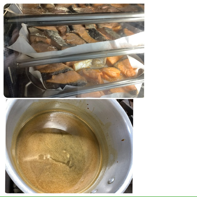 酢、きび糖、濃口醤油、カレー粉を混ぜ合わせた調味料に小麦粉をつけて焼いた鮭をくぐらせると完成です。