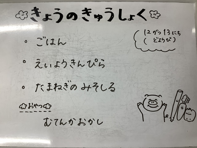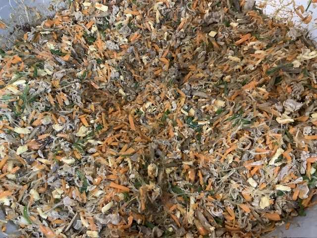 錦ヶ丘の人気メニュー、栄養きんぴらでした。豚肉、みじん切りにした生姜、野菜がたくさん入り、栄養満点。おかわりをする子の行列が絶えませんでした。