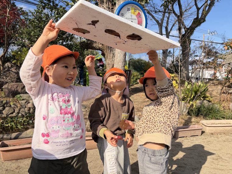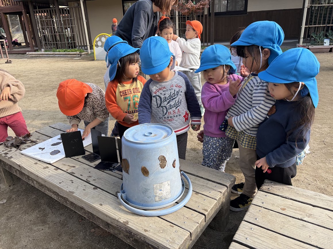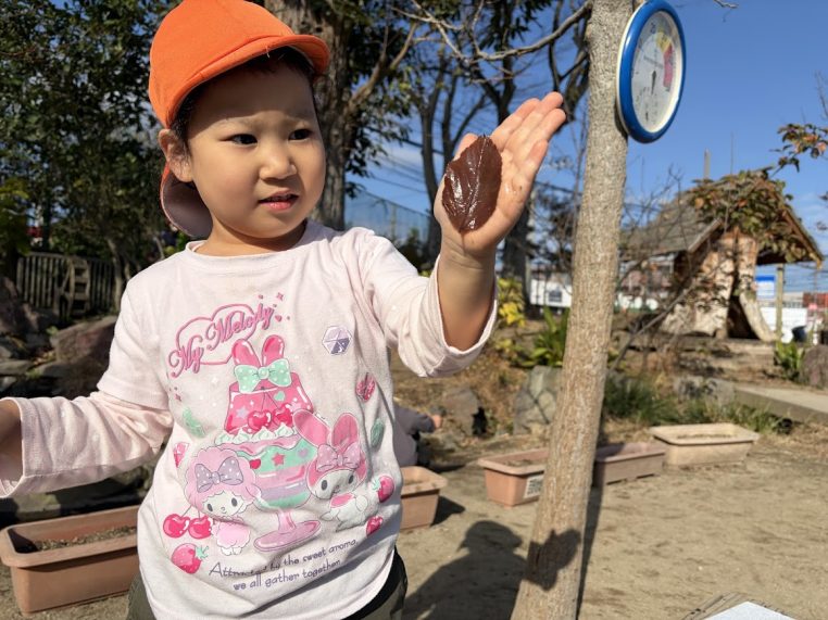 12月下旬、園庭で遊んでいた3歳児が、濡れた葉っぱを手に乗せて「くっついた!落ちない!」という発見をしていました。