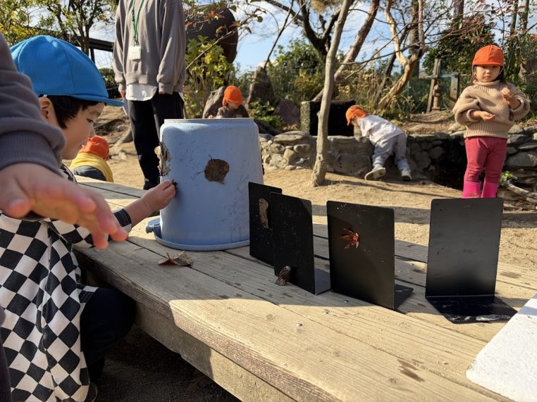 「乾いたからだよ!」という呟きに驚きました。遊びを通して葉の性質、自然の法則を学ぶことができていました。