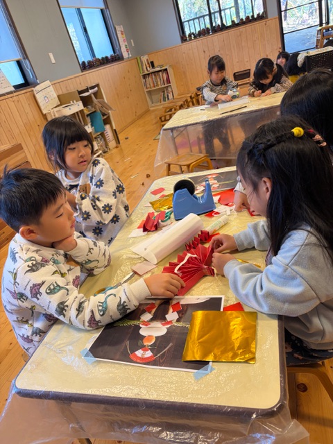 必要な材料(折り紙、画用紙)を考え、橙やうらじろの代わりになるものを園中から探し回って完成させました。
