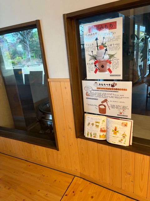 もちつき会までに、ポートフォリオや絵本を掲示して子どもたちにもちつき会があることを伝えていました。いきなり活動をするのではなく、子ども達が生活している中に少しずつ行事を溶け込ませることで、より理解しやすくするためです。今回ついたもちは、鏡餅にして玄関に飾りました!