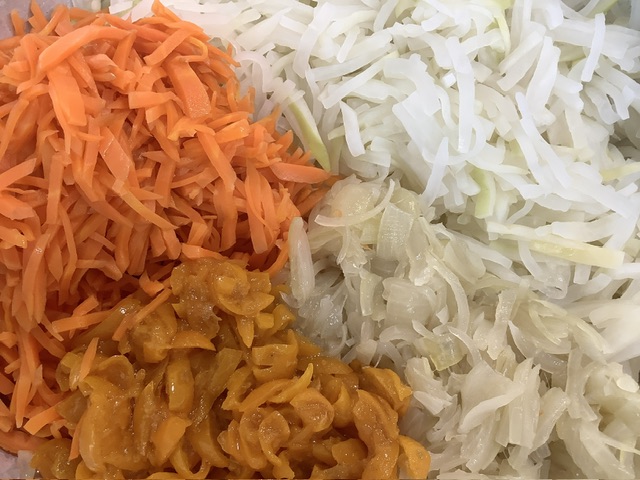 スチームにかけた35ファームの大根・にんじん・玉ねぎと合わせ、酢・金柑シロップ・塩を混ぜたマリネ液で和えています。きび糖の代わりに金柑シロップを使うことで、マリネ液にも金柑の爽やかな香りが広がりました。