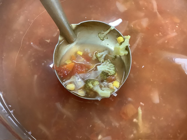 大丸鰹節店の合わせ出汁パックをじっくり煮出し、トマト・玉ねぎ・ブロッコリー・とうもろこしが入ったスープです。味付けには、給食室手作りの玉ねぎ麹を使っています。