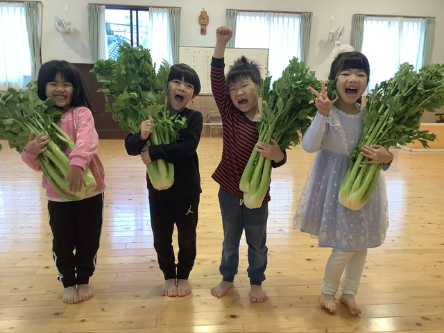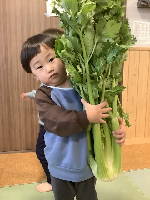 大きなセロリをこども達に見せると、全身をいっぱい使って持ち上げたり、かっこいいポーズを決めたりしてくれました。