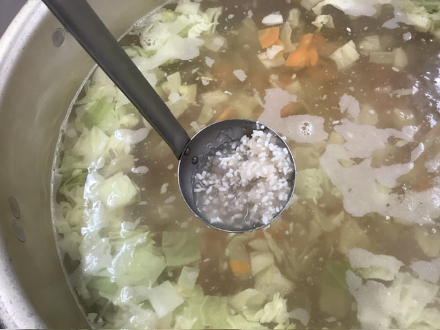 キャベツ・にんじん・玉ねぎが入ったスープに、給食室手作りの玉ねぎ麹を加えて味を調えました。