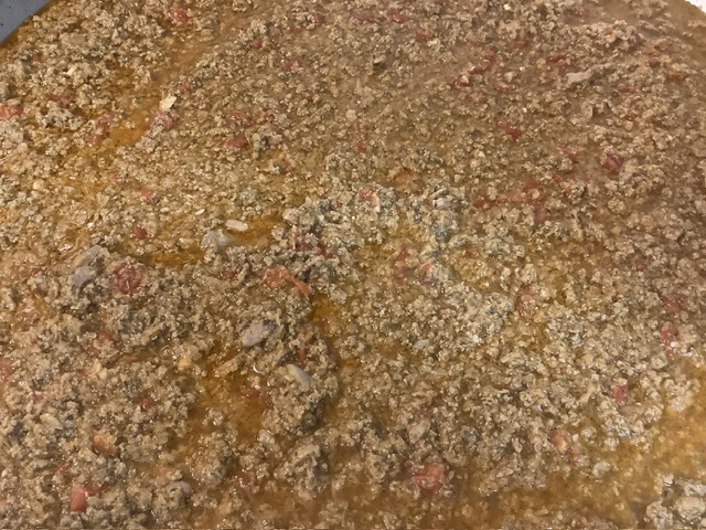 みじん切りにしたセロリ、玉ねぎ、にんじん・トマト・ひき肉と、南州農場のベーコン、ウインナーをじっくり炒めます。水は加えていませんが、野菜からたっぷり水分が出てきます。