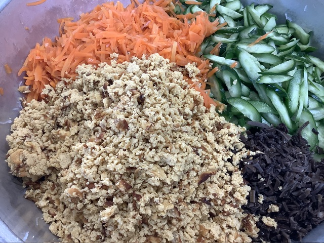 緑豆春雨、ヤブサメファームの卵、きゅうり、にんじん、きくらげを甘酢で和えました。