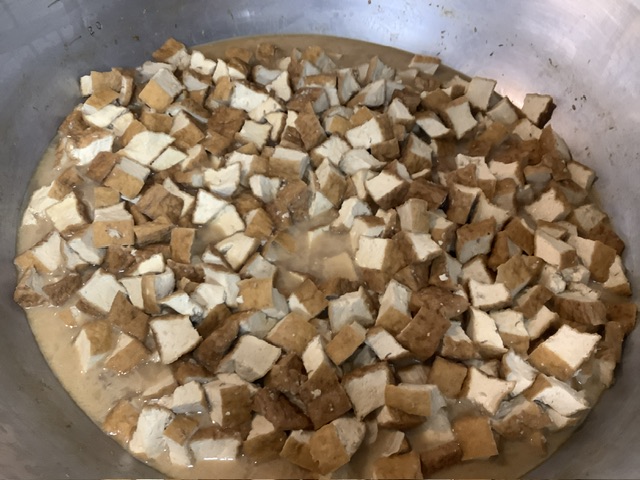 厚揚げを一口大に切り、昆布と鰹節でとった出汁、スライスしたにんにく、酒、きび糖、濃口醤油、味噌を加え、コトコト煮詰めます。