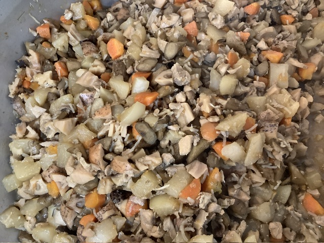 炒り鶏には、鶏肉、大根、にんじん、蒸し煮したごぼう、レンコン、干し椎茸、しらたき、いんげんが入りました。
