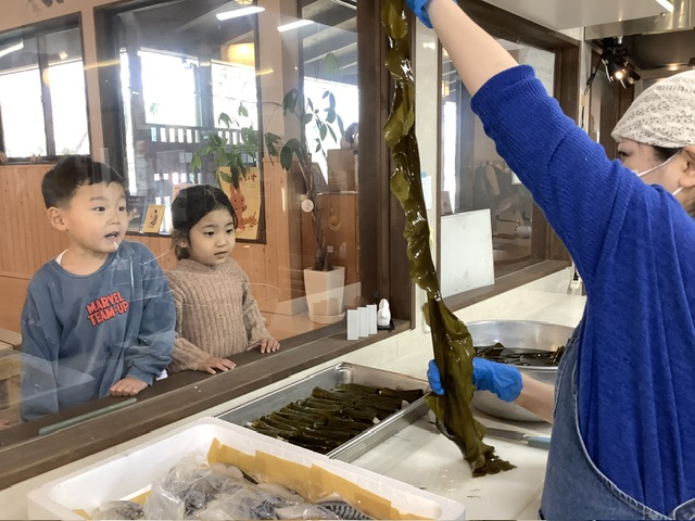 大きくて長い昆布を見て「わあ!」と目を見開いていたり、くるくると巻いていく様子をじーっと見ていたり、興味津々の様子。