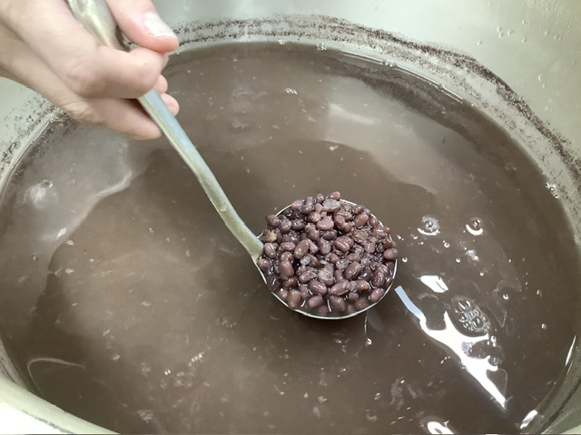 小豆は下茹でをしてアクを抜いてから、きび糖と一緒にじっくり炊いています。