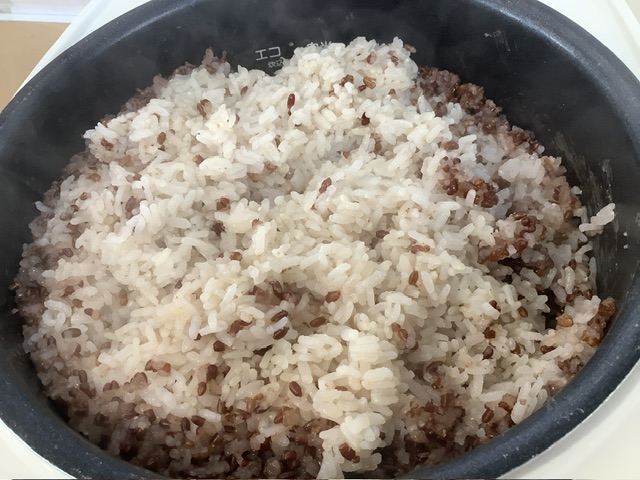 普段食べている五分づき米に、赤米を混ぜて炊きました。