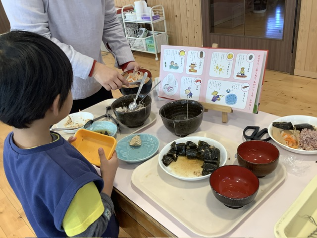 また、今日の献立は、「おせちのみんなあつまって!」(作・絵 真珠まりこ/出版 ひさかたチャイルド)とのコラボ給食です。絵本の昆布巻きを指さしながら「絵本と同じ!」と見せてくれる子もいました☺️