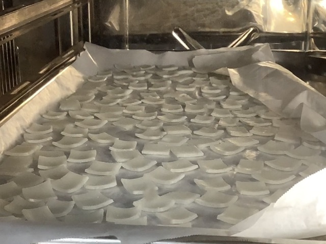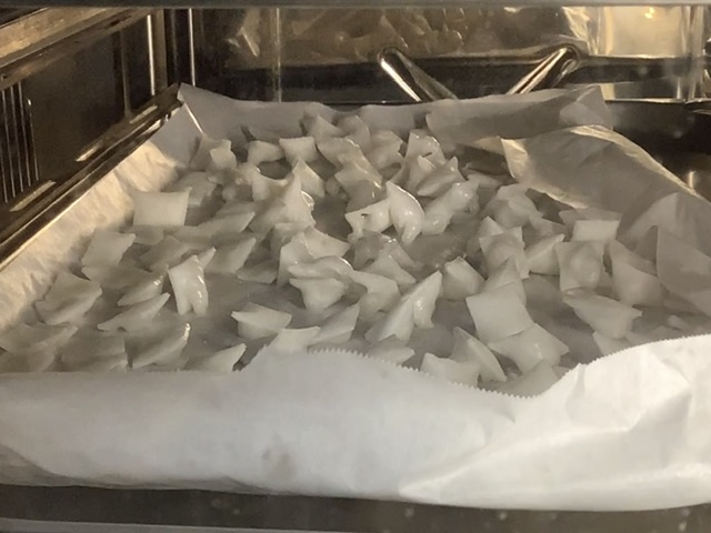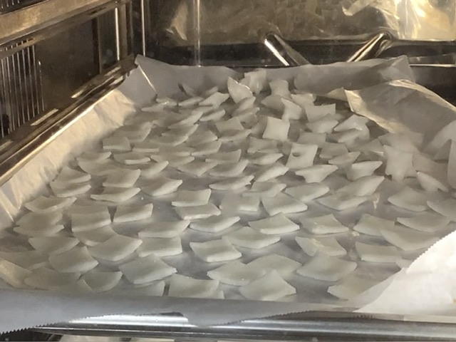 餅は薄くスライスされたものを一口大にカットし、オーブンで焼いてパリパリ食感にしてからます。